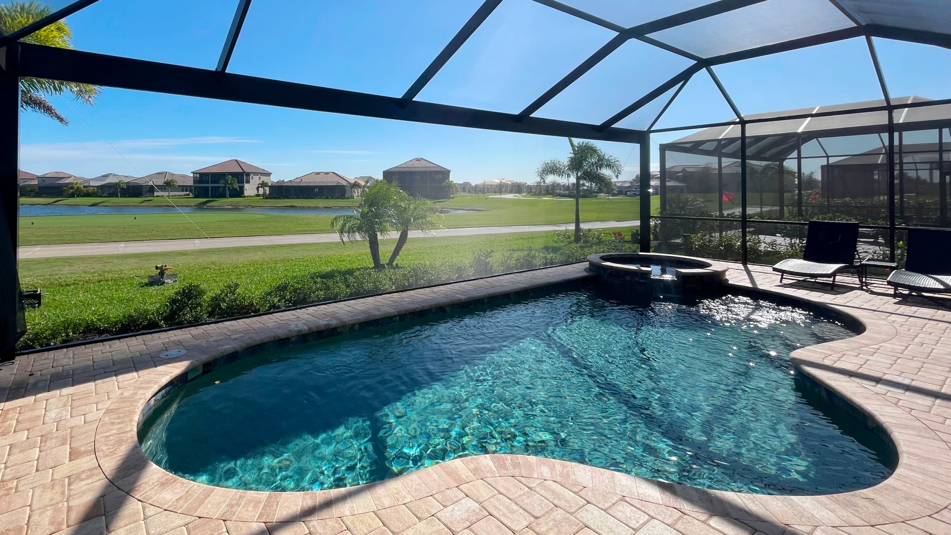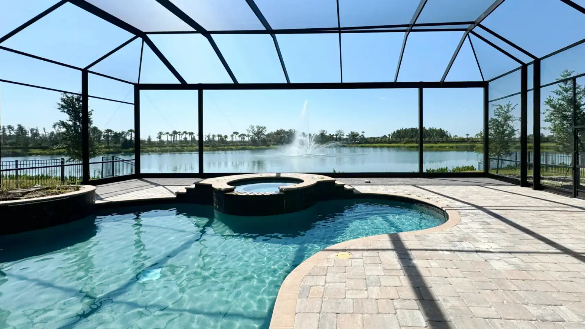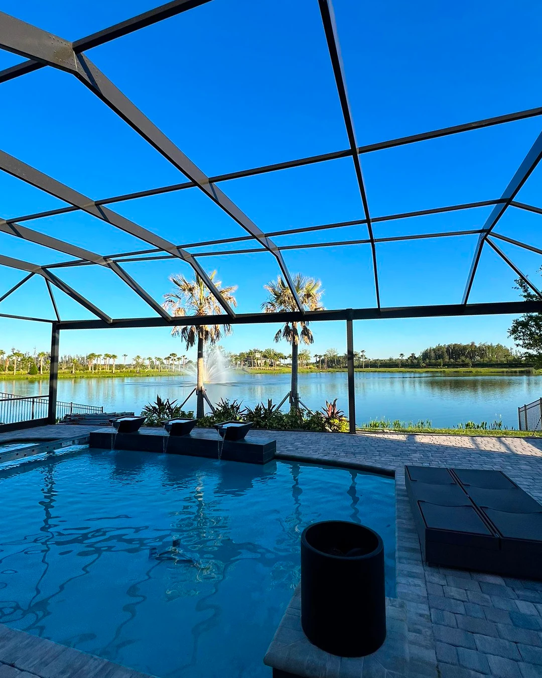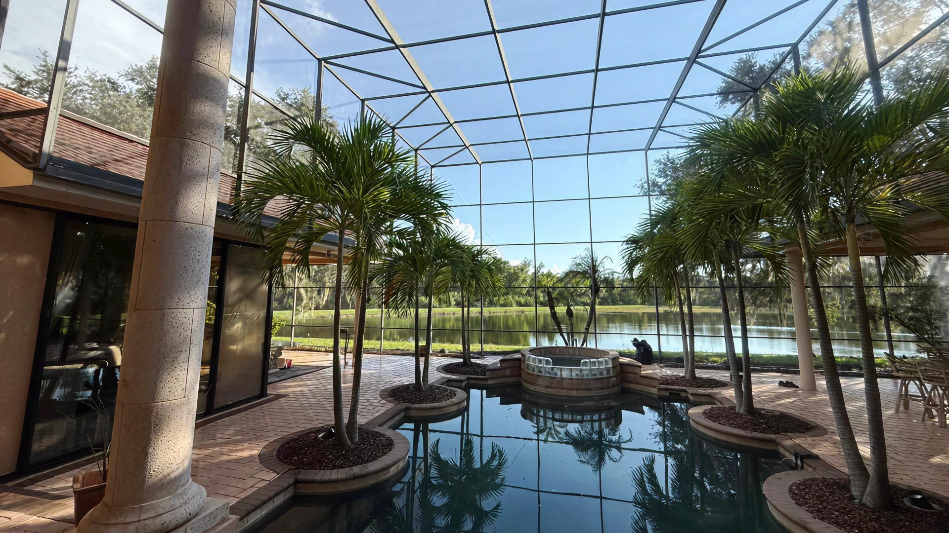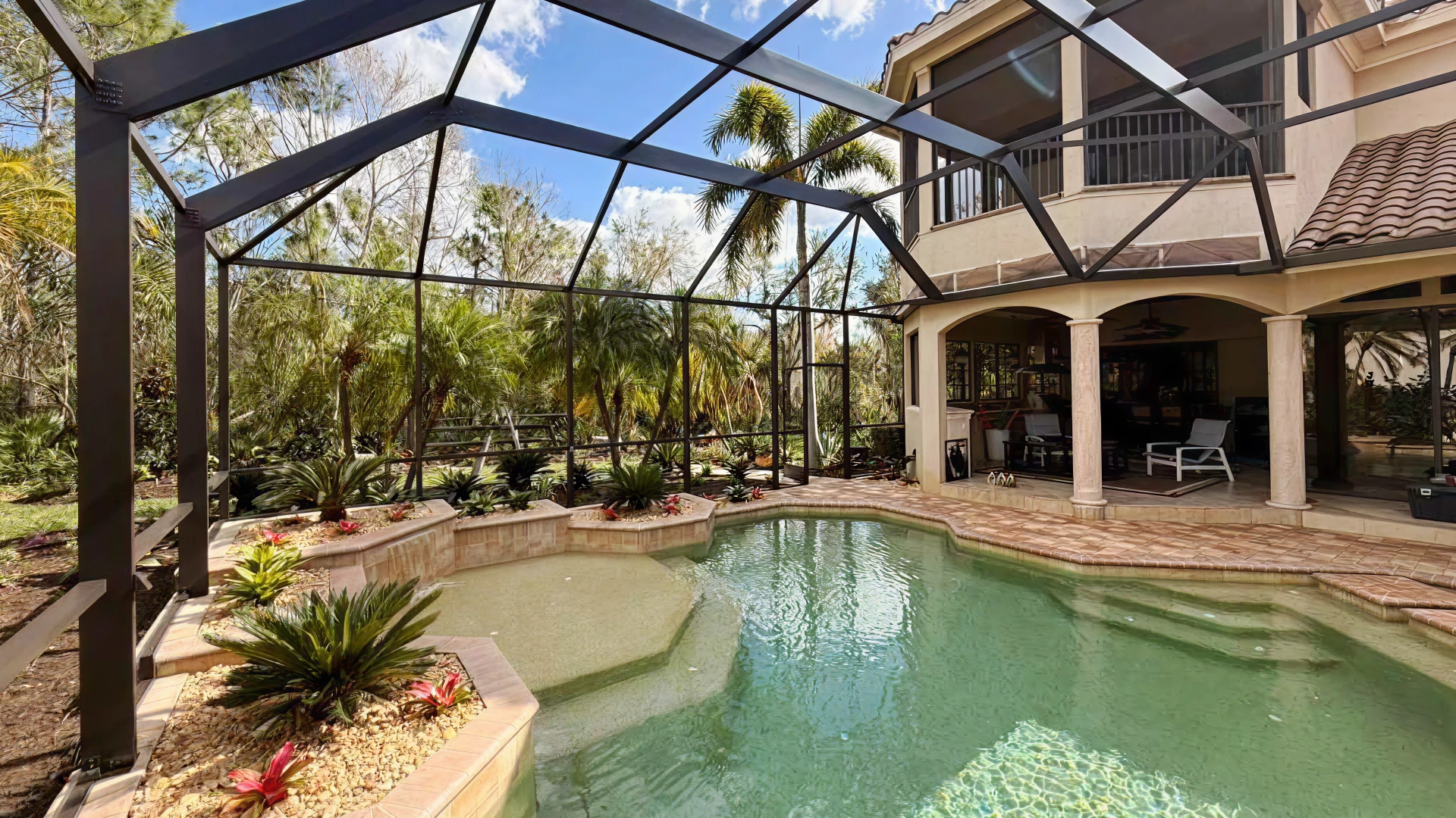 A panoramic pool cage removes multiple vertical posts to create wide, unobstructed views of your backyard and landscape.